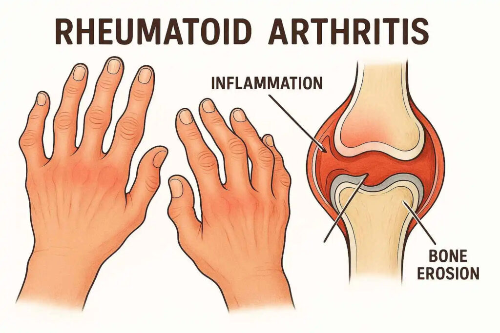 Rheumatoid Arthritis (RA) is a chronic autoimmune disease that causes the body’s immune system to mistakenly attack its own tissues — particularly the lining of the joints (synovium). This leads to inflammation, swelling, stiffness, and pain in multiple joints. Over time, untreated RA can cause joint deformities, bone erosion, and even affect other organs like the heart, lungs, and eyes.